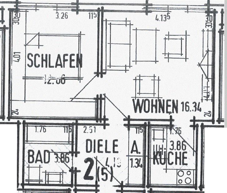 - Raumaufteilung: Wohn- und Esszimmer, Küche, Schlafzimmer, Bad, Diele